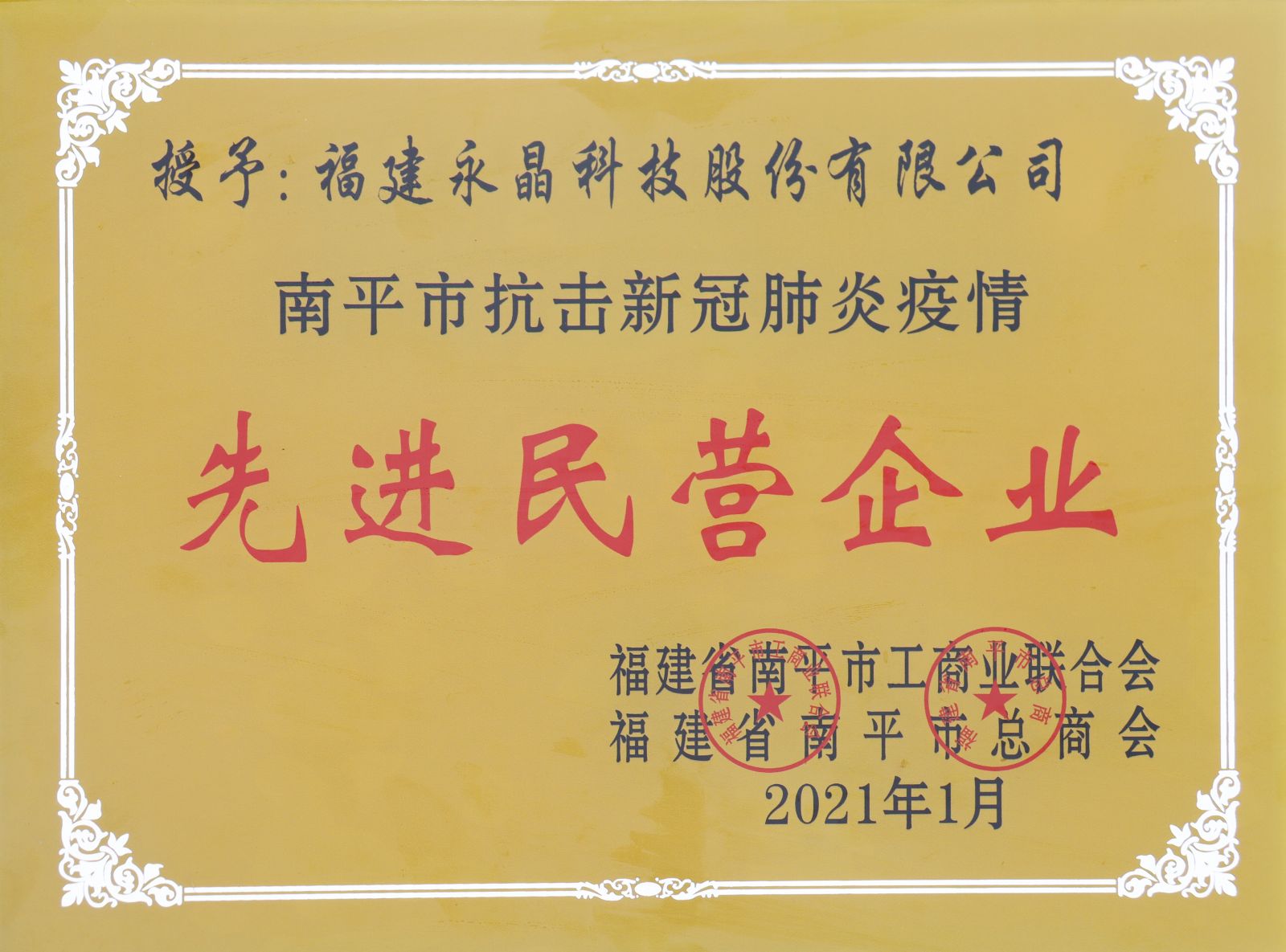 近日,福建永晶科技股份有限公司(以下簡稱永晶科技)被南平市工商業聯合會、南平總商會授予“南平市抗擊新冠肺炎疫情先進民營企業”榮譽稱號。以此表彰永晶科技在疫情防控期間積極履行企業社會責任、奮力投身抗疫行動、踐行公益慈善事業所作出的突出貢獻。